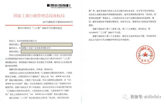依據(jù)《商標(biāo)法》第十三條第三款、第三十五條規(guī)定,我局決定:第14112834號“三六零”商標(biāo)不予注冊。