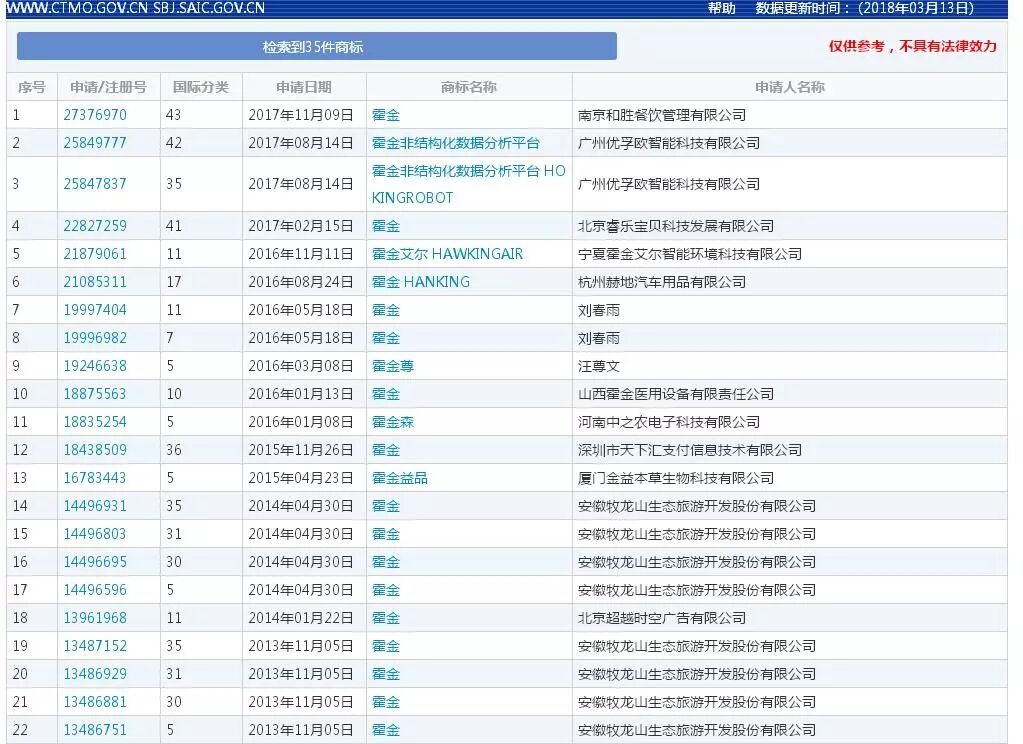 不過(guò),值得玩味的是,“霍金”作為商標(biāo)名稱,在中國(guó)大陸地區(qū)的商標(biāo)注冊(cè)情況,卻與霍金本人無(wú)關(guān)。小編在中國(guó)商標(biāo)網(wǎng)的商標(biāo)綜合查詢平臺(tái)上以“霍金”作為商標(biāo)名稱進(jìn)行檢索,得到的35項(xiàng)檢索結(jié)果涵蓋了商標(biāo)注冊(cè)國(guó)際分類中的數(shù)十個(gè)分類,其中一家生態(tài)旅游開(kāi)發(fā)公司便在總計(jì)8項(xiàng)分類中均提交了“霍金”的商標(biāo)注冊(cè)申請(qǐng)。