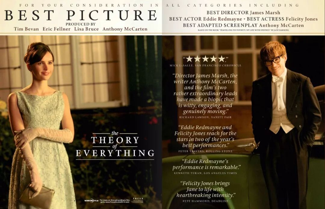 故事的最后,在2014年上映的電影《萬(wàn)物理論》中,飾演霍金的英國(guó)男演員埃迪·雷德梅尼因優(yōu)秀演技而贏得美國(guó)演員工會(huì)獎(jiǎng)最佳男主角以及第87屆奧斯卡金像獎(jiǎng)最佳男主角等獎(jiǎng)項(xiàng),而霍金亦提供了計(jì)算機(jī)化的聲音給該片。